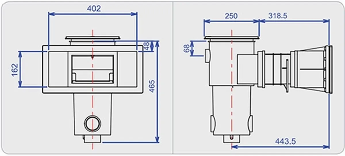 Aquareva maakt gebruik van hoogwaardig ABS-kunststof met een anti-UV behandeling. Hierdoor behouden de skimmers hun briljante kleur en blijven ze resistent tegen chloor, zout en andere zwembadchemicaliën. Het skimmerlichaam is bij elke uitvoering identiek — ideaal wanneer je tijdens renovatie overstapt naar een liner of een versterkte 150/100e liner.