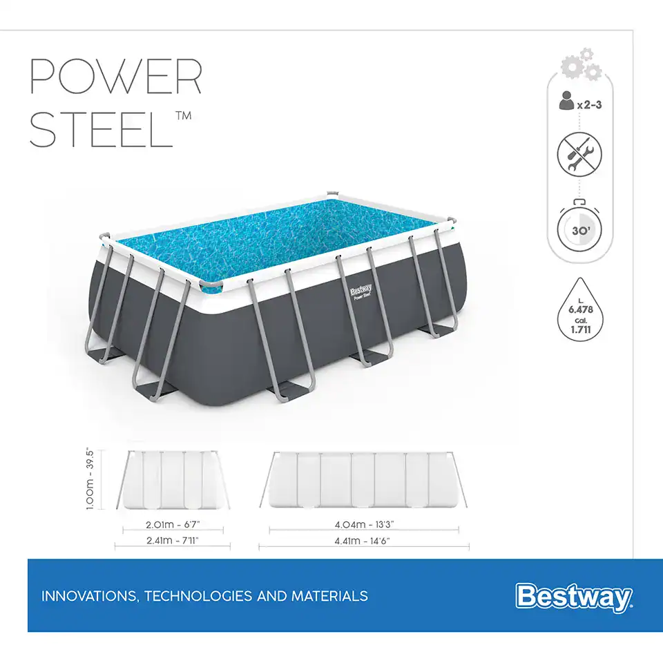 Het Bestway Power Steel zwembad – 404 x 201 x 100 cm is een compact maar stevig opzetzwembad dat perfect is voor gezinnen met kinderen. Dankzij het rechthoekige ontwerp benut je de beschikbare ruimte optimaal en is het zwembad geschikt voor ongeveer 6 personen om comfortabel in te zwemmen.