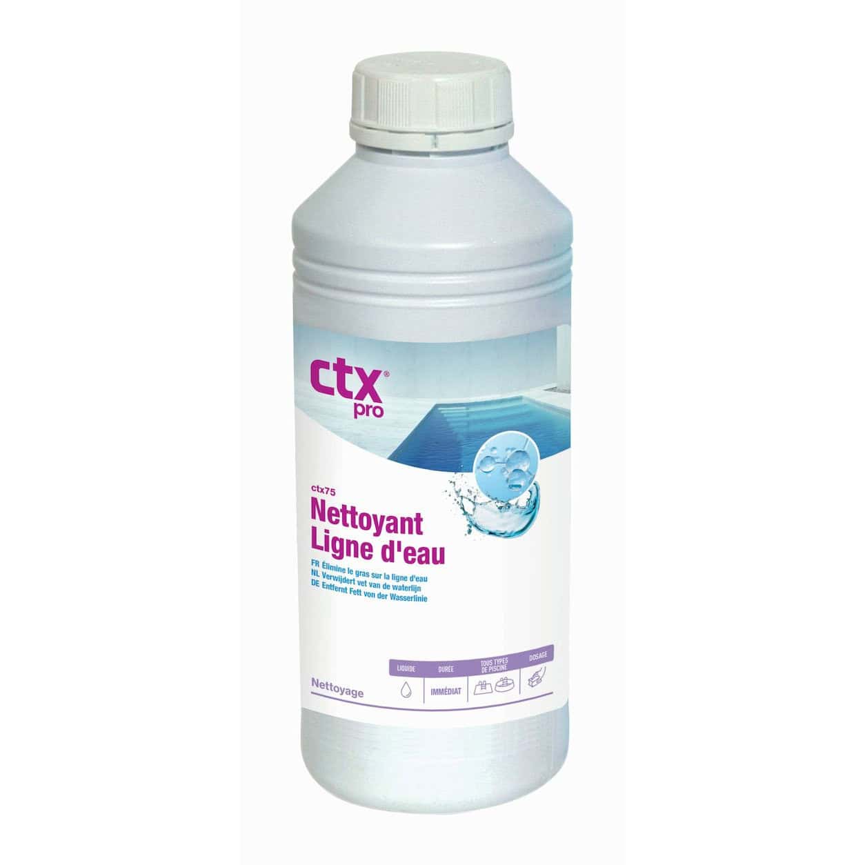 Krachtig reinigingsmiddel voor het verwijderen van vet en vuil uit de waterlijn van uw zwembadwanden. De CTX-75 waterlijn reiniger mag zowel in zwembaden als in spa’s of Jacuzzi’s gebruikt worden. Dit product heeft geen invloed op de waterkwaliteit en schuimt niet.