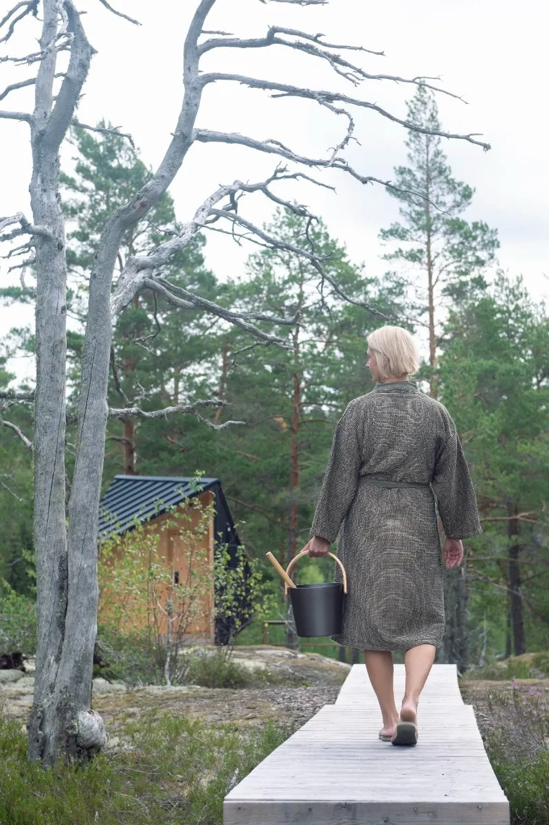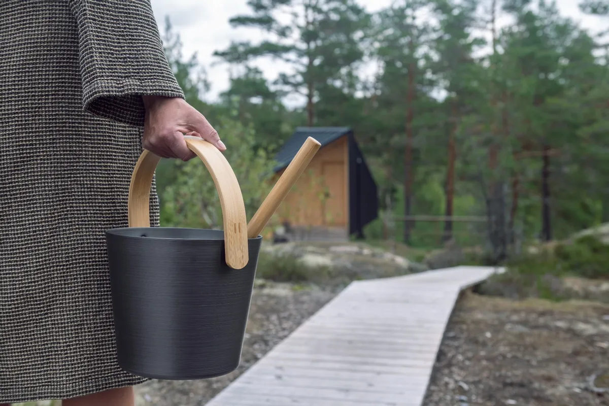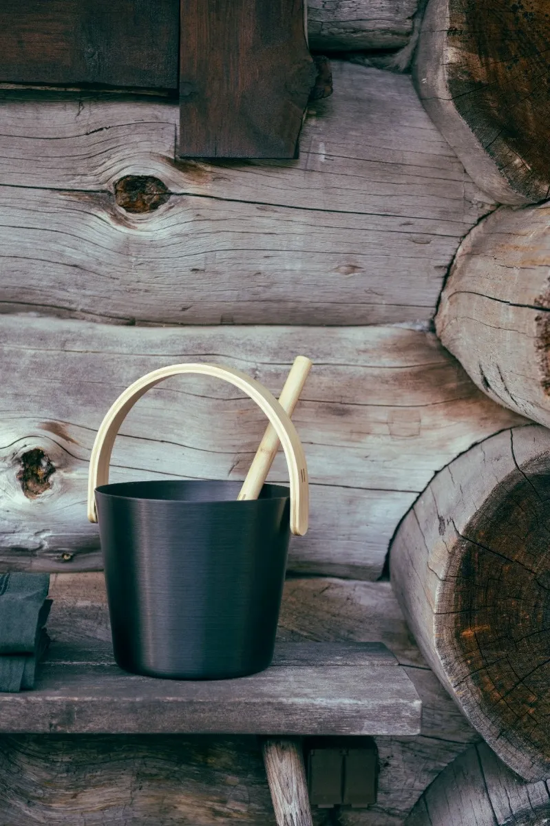 De zwarte aluminium emmer straalt rust en eenvoud uit – precies wat je zoekt in een ontspannen saunasfeer. De warme bamboe beugel vormt een mooi contrast met het matte metaal en ligt comfortabel in de hand. Dankzij het doordachte ontwerp is de emmer niet alleen een lust voor het oog, maar ook praktisch in gebruik en eenvoudig te verplaatsen, zelfs met heet water.