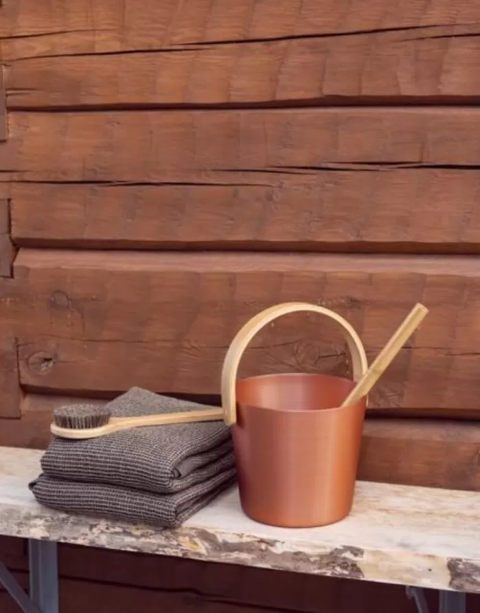 De Rento sauna emmer met bamboe beugel – koper/bruin straalt pure Scandinavische elegantie uit. De warme koperkleurige glans in combinatie met het natuurlijke bamboe handvat maakt deze emmer tot een echte blikvanger in elke sauna. Gemaakt van duurzaam aluminium en thermisch behandeld bamboe, is hij niet alleen stijlvol maar ook bijzonder functioneel en bestand tegen hoge temperaturen.