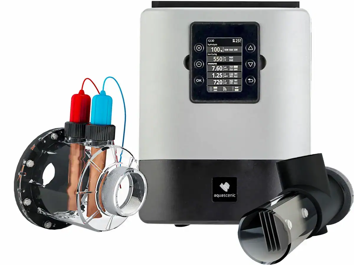 De Aquascenic HD2 van Sugar Valley is de grotere uitvoering van het bewezen Aquascenic-systeem voor volledig chloor- en zoutloze waterbehandeling. Dankzij de combinatie van hydrolyse en koper/zilver ionisatie wordt het zwembadwater grondig ontsmet en helder gehouden — zonder toevoeging van chemicaliën. Deze complete set is geschikt voor zwembaden, zwemvijvers en natuurvijvers tot 110 m³ en wordt inclusief alle benodigde installatiematerialen, sensoren en doseerpomp geleverd.