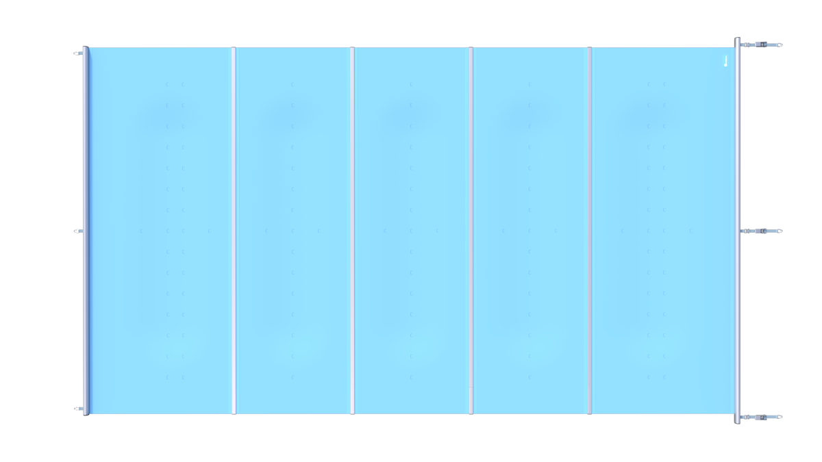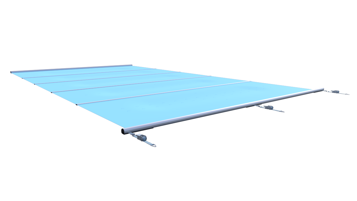 De Flat-afdekking onderscheidt zich door haar zeer platte centrale profielen, waardoor het doek laag en strak op de zwembadrand ligt. Dit zorgt voor een minimalistische afwerking zonder storende hoogteverschillen.