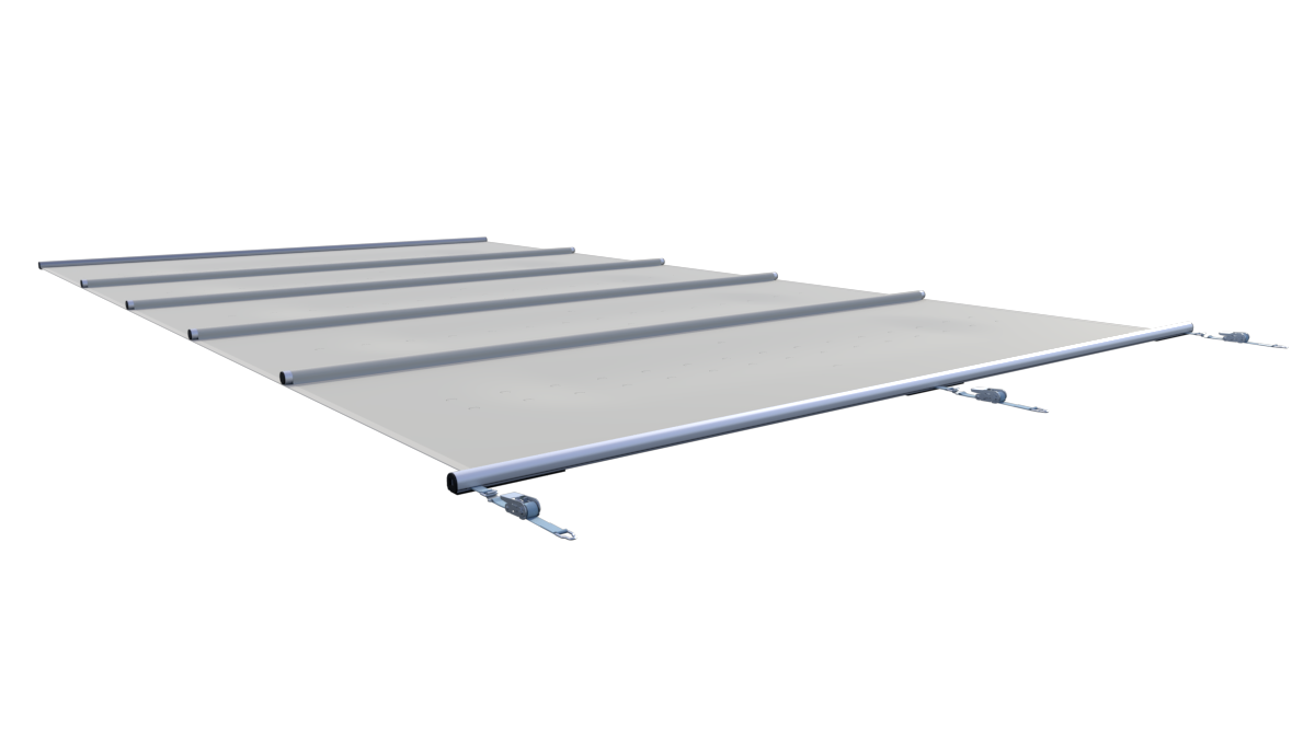 Dit slimme design biedt twee belangrijke voordelen. Allereerst zorgt het voor een moderne en rustige uitstraling; u ziet enkel het strakke lichtgrijze vlak zonder onderbrekingen van glimmende buizen. Daarnaast zijn de aluminium profielen door deze methode optimaal beschermd tegen weersinvloeden, wat de duurzaamheid van de totale afdekking aanzienlijk verlengt.