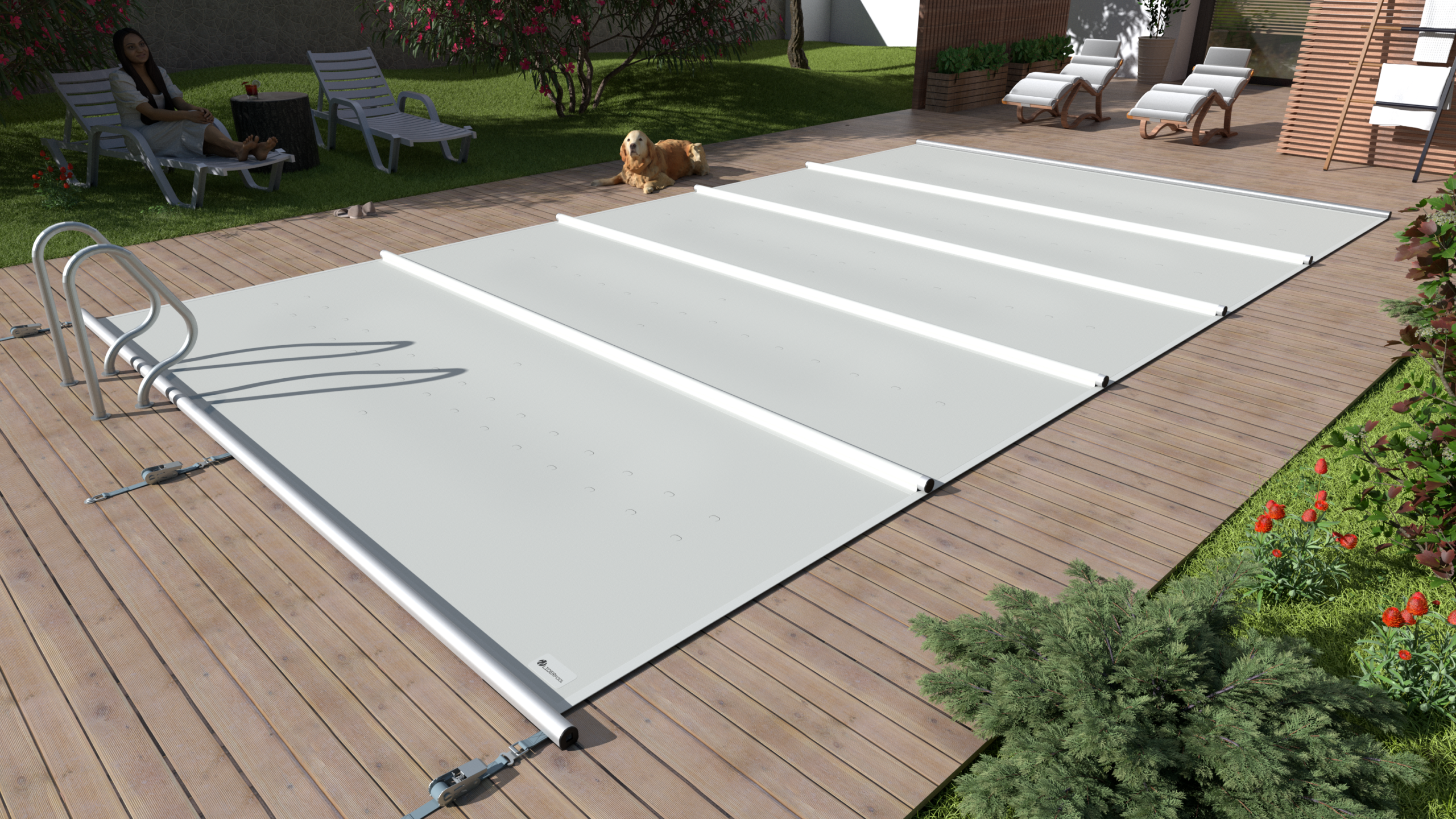 Voor een optimale werking en veiligheid vereist dit systeem een minimale marge van 20 cm aan elke zijde op de randstenen of het terras rondom het bad. De afdekking wordt standaard geleverd met een overlap, zodat ook de zijkanten goed afgesloten zijn tegen vuil en lichtinval.